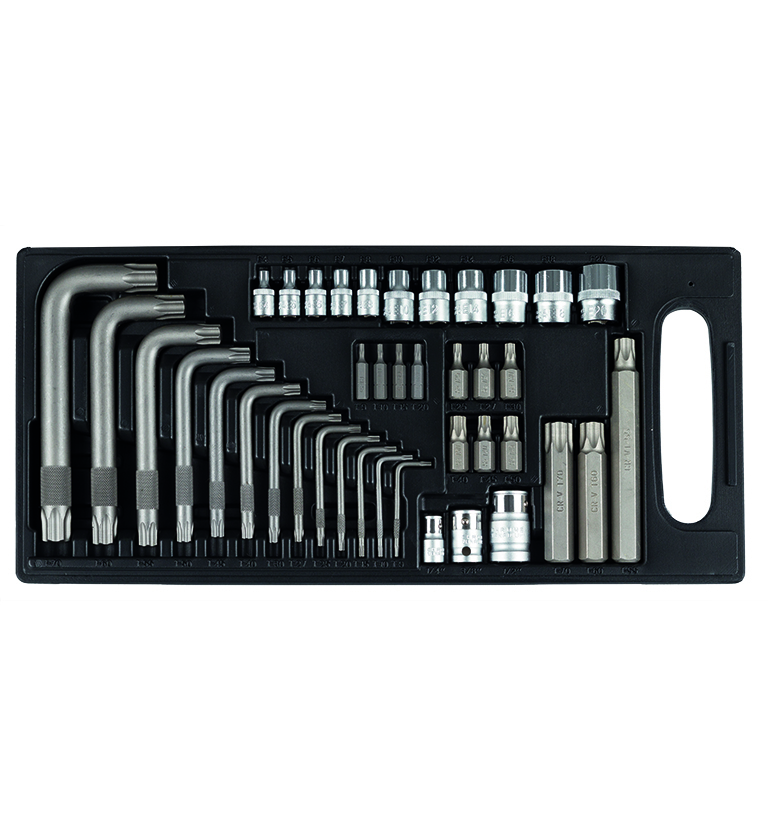 - High resistance toolbox 5 star sockets E4-E8, 6 Star sockets E10-E20, 1 coupler ¼” DR. x ¼” Hex, 1 coupler 3/8” x 10 mm Hex, 1 coupler ½” x 14 mm hex, 13 L-type star key wrench T9-T70, 4 star bits ¼” 30 mm Т9-Т20, 6 star bits ¼” 10-30 mm Т25-Т50, 2 star bits ¼” 14-75 mm Т60,Т70, 1 star bit ¼” 14-120 mm Т55